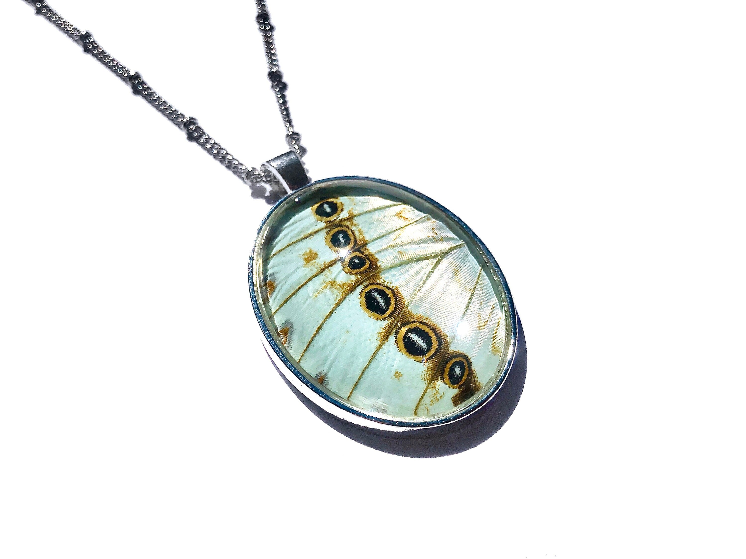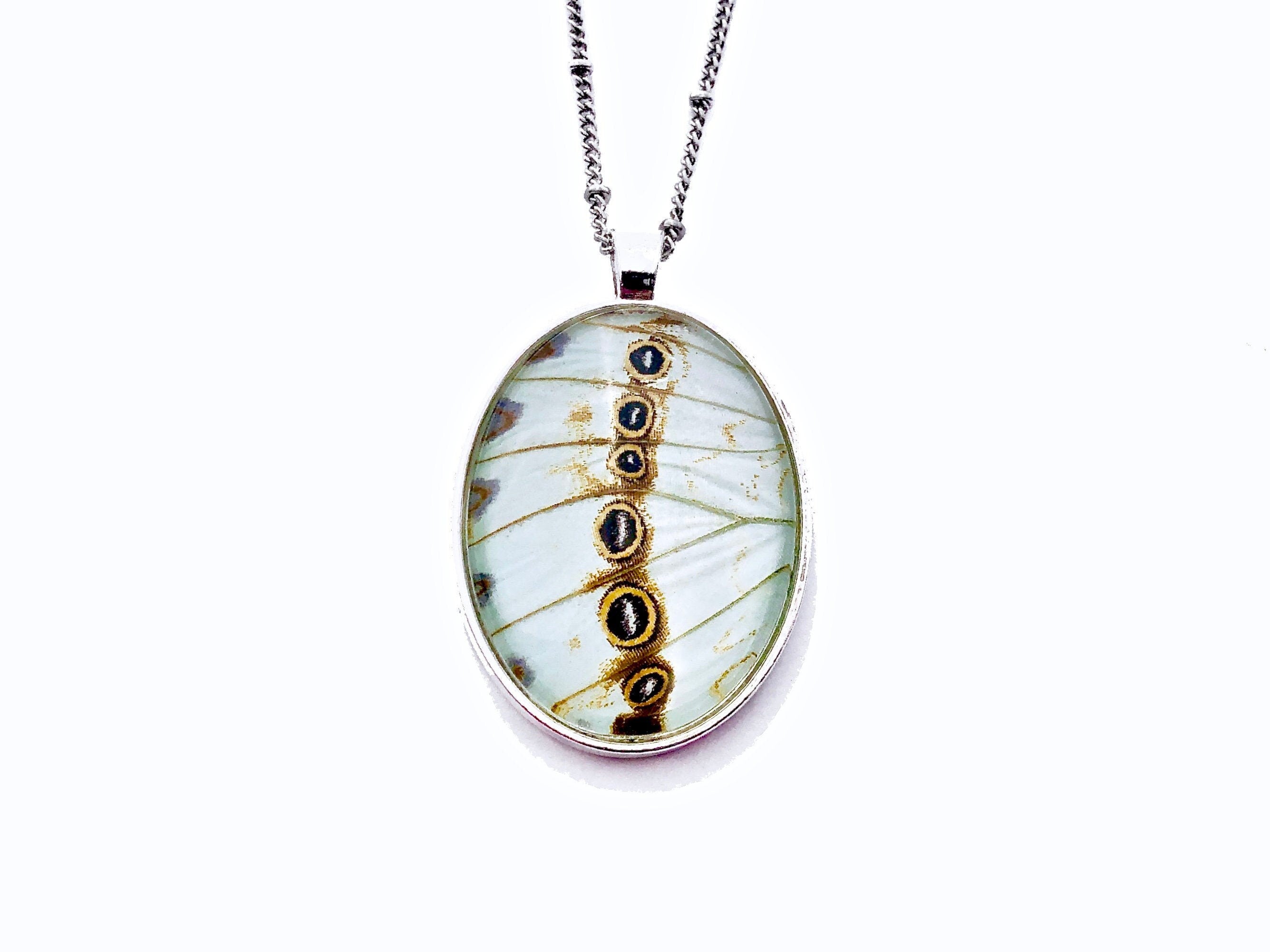 ★ This beautiful butterfly wing pendant is handmade from a REAL Morpho Luna Butterfly wing! (Please read below for more on how I ethically obtain the wings!) The butterfly wing is expertly embedded under a large 1.2" x 1.6" magnified glass cabochon using my original process and set in a silver finish bezel. The Morpho Luna Butterfly is found in South America. The butterfly's wings are a delicate slightly translucent white and adorned with anywhere from 3 to 6 brown and golden "eyespots."